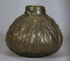 波山がデビューした明治30年代は、1900年のパリ万国博覧会で見られたように、アール・ヌーボーが西欧の芸術界を席巻していました。波山の場合、エミール・ガレに見られる自然主義的な表現に近く、生き生きとした感性で動植物が描かれ、単なる西欧の模倣というレベルから抜け出なかった国内の陶芸家たちとは異なり、東京美術学校で修得した彫刻技法や更科デザインなど日本の伝統美を土台に創造され、西洋のレベルを超えた、実に、のびやかで、みずみずしい文様が表現されています。 彩磁葡萄文花瓶 → |